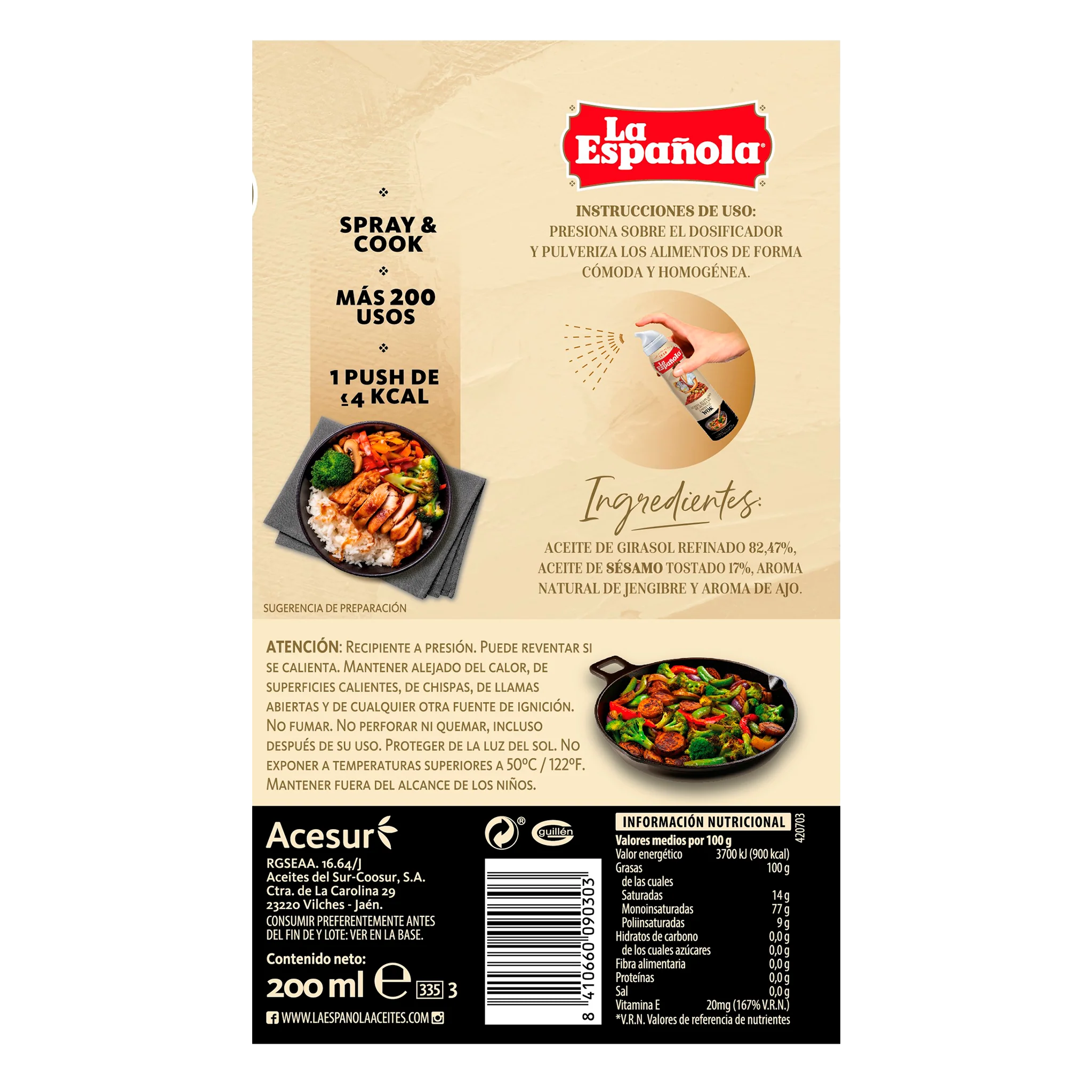 The special Seed Oil Spray for Wok is perfect for anyone seeking to enjoy a Spanish twist to Asian cuisine with less fat and maximum flavour. It is commonly used on everything from stir-fried prawns to mixed vegetable dishes and Asian-inspired noodles, creating dishes with Spanish flair and health-conscious appeal.